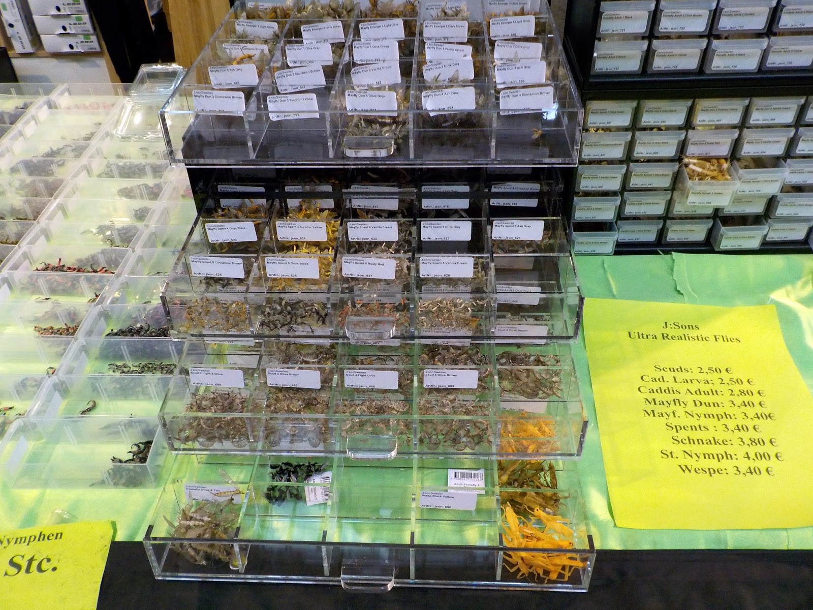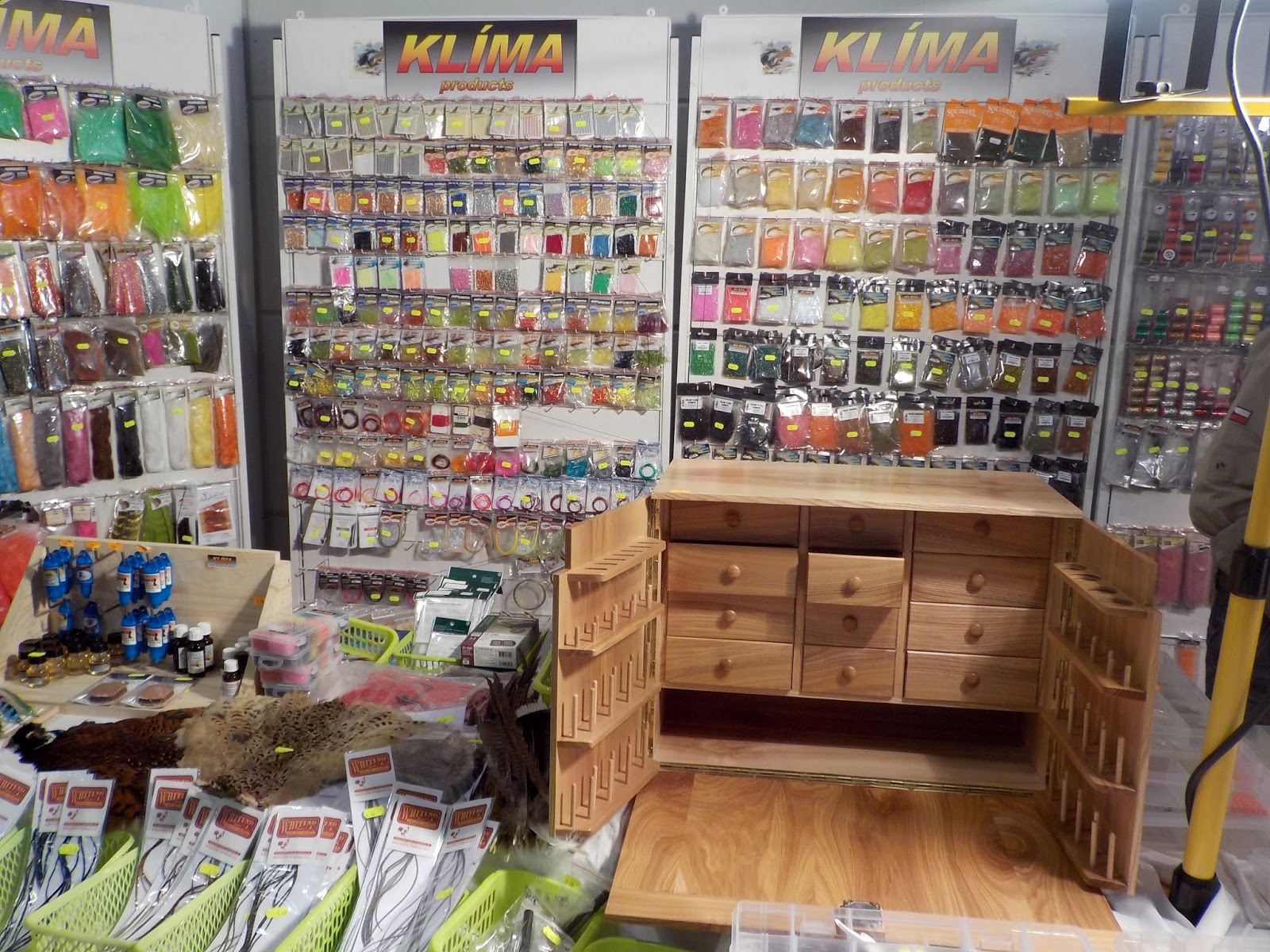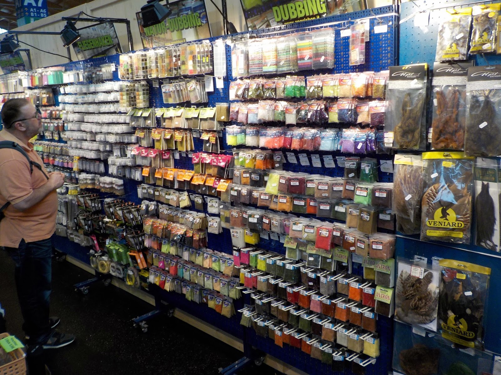 Hosszú standok sorain válogathattam a legkülönbözőbb légykötő anyagok, kész legyek, szerszámok, felszerelések, ruházatok újdonságaiból, határt csak az ember pénztárcája szabhat ebben a kavalkádban…